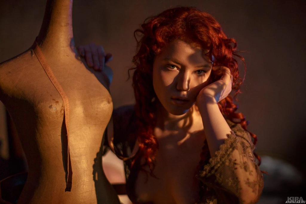 a serious expression on her face and is holding a mannequin's torso in her hands. Her gaze is directed off to the side, away from the camera. The background suggests