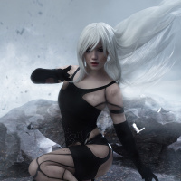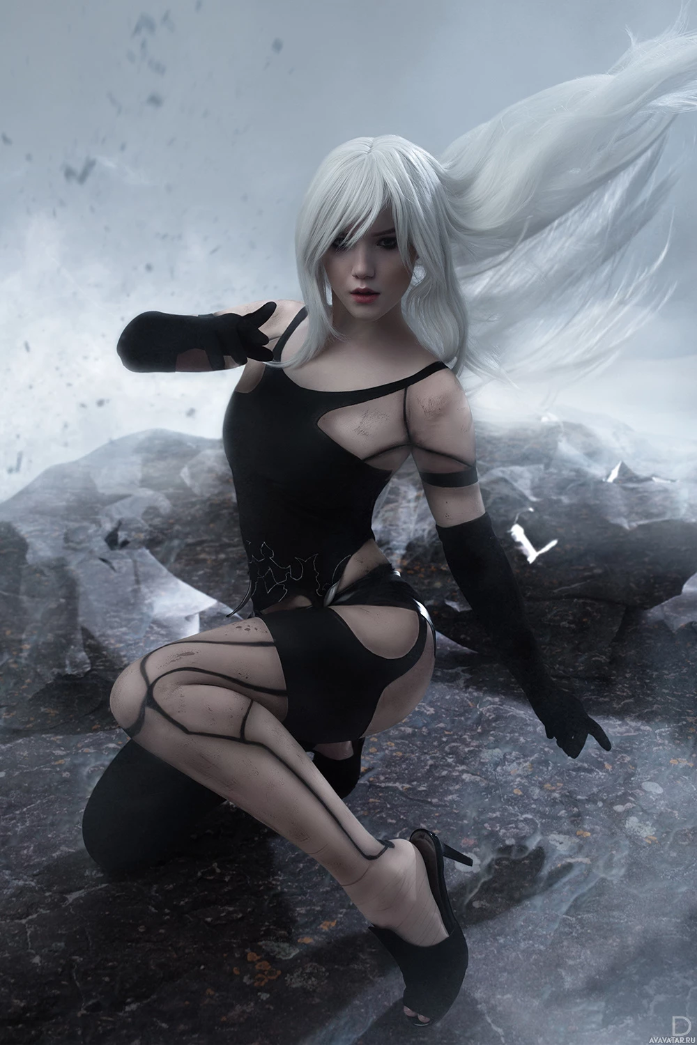 chaotic scene. Her pose is confident and defiant, which aligns with the action-oriented theme associated with the game Nier: Automata, where players engage in combat against
