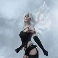 cosplay culture, where fans dress up as characters from various media, such as movies, TV shows, and games. The character's pose and the setting give the image a dramatic and otherworldly feel.