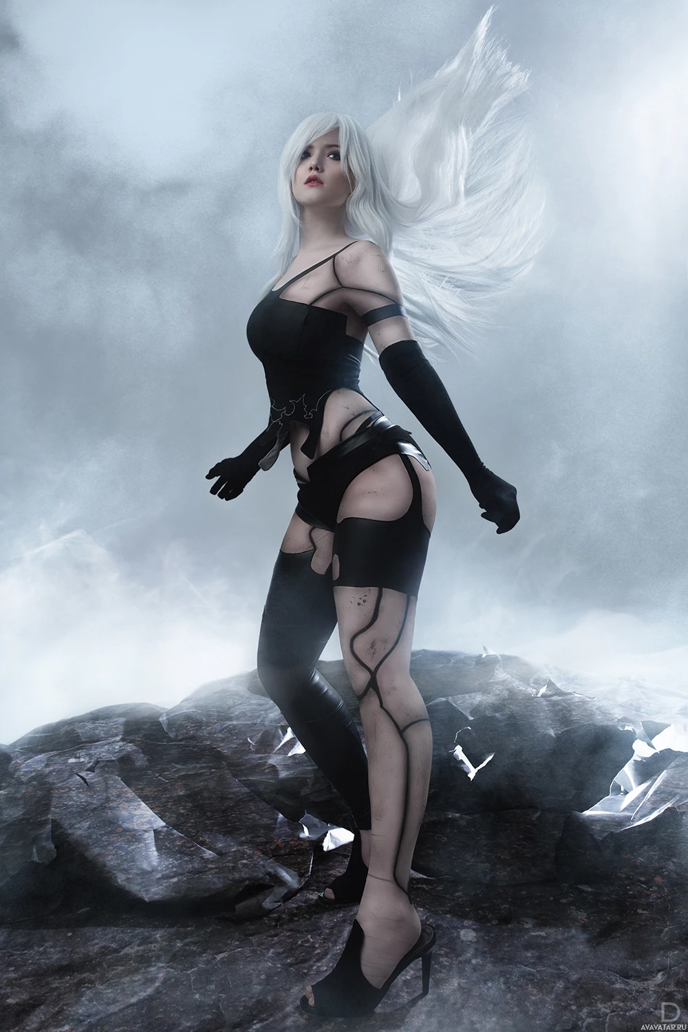 a female character dressed in dark, futuristic armor with elements of fantasy design. She has white hair and is posed on what appears to be an outcrop or rocky area against a misty background, which suggests she may be from