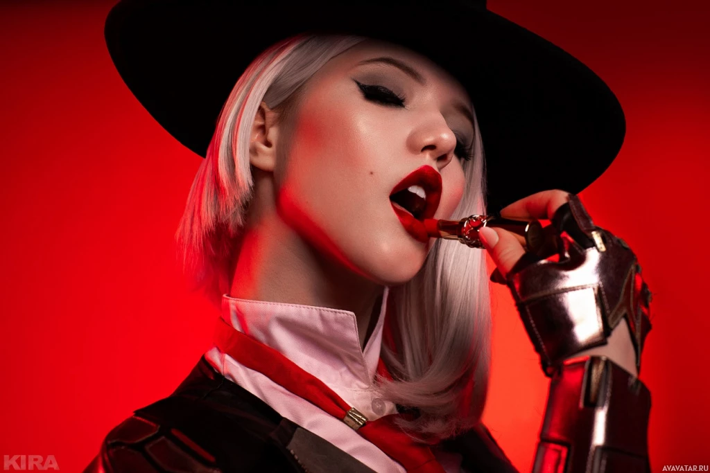 a black hat, makeup that includes a bold red lip color, and has their eyes closed. They are holding what appears to be a lollipop or candy stick to their lips. The setting suggests a themed photoshoot, possibly inspired by the character's style in the game.