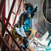 The image shows a person dressed in cosplay, portraying the character Tracer from
