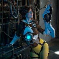 The image features a person dressed in a costume resembling Tracer, a character from