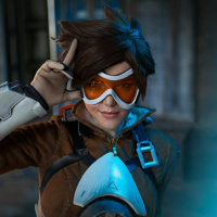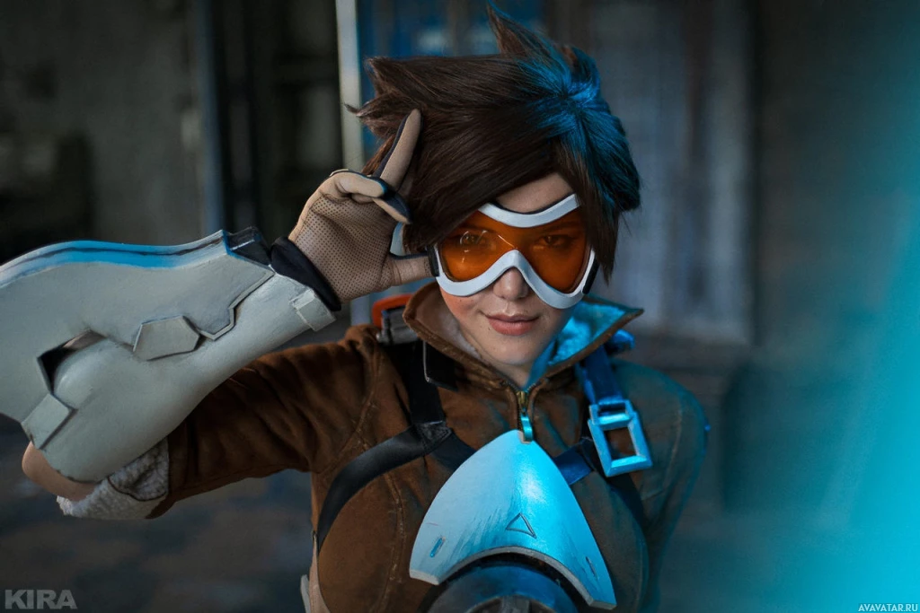 blue armor, complete with the character's signature orange goggles and helmet. The pose mimics Tracer's iconic stance where she points her