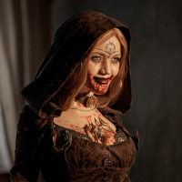dark hair styled with horns, which adds to her menacing appearance. The setting appears to be an old room with