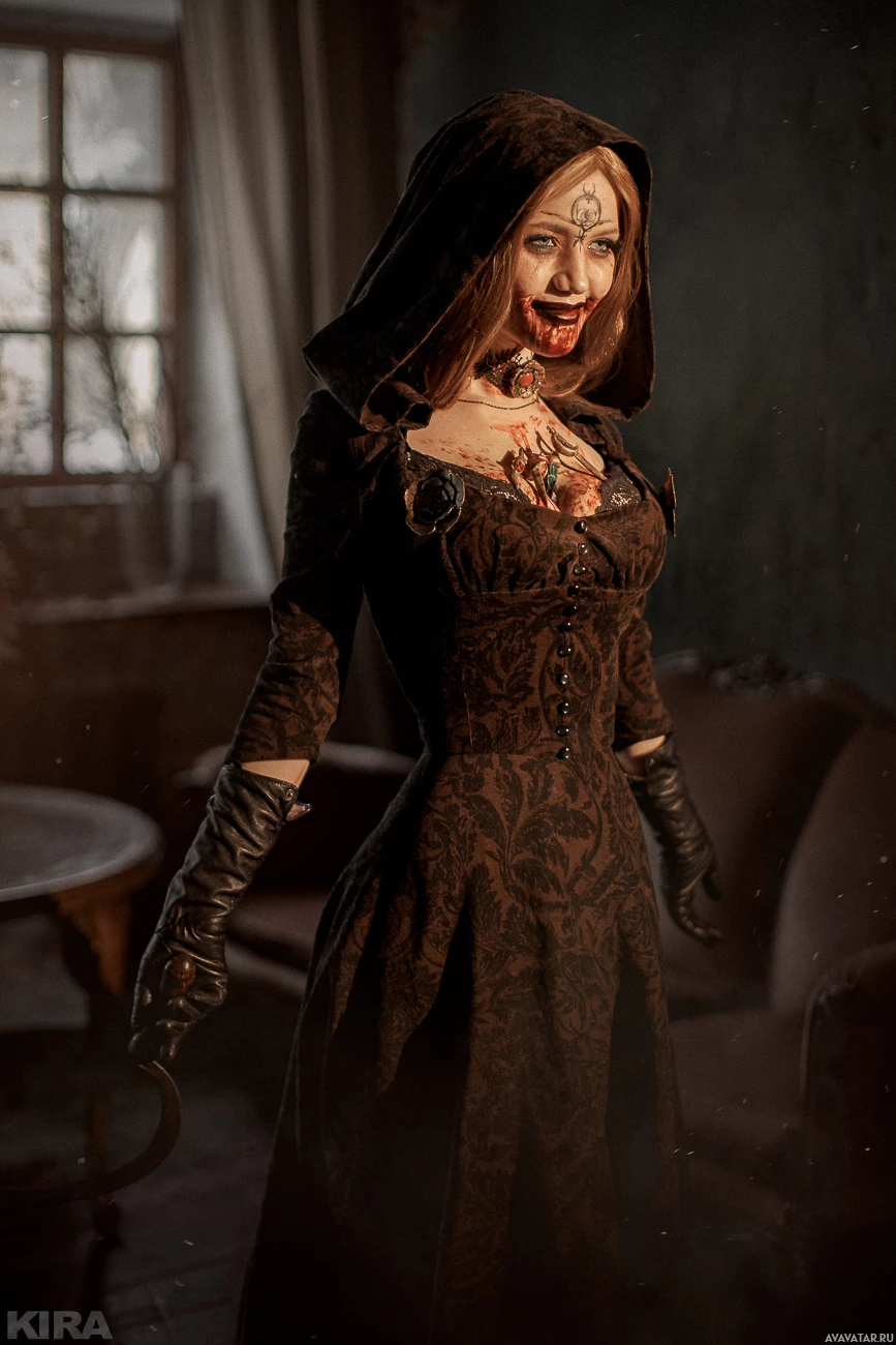 the video game "Resident Evil Village." She is dressed in a black, gothic-style dress that resembles historical or