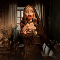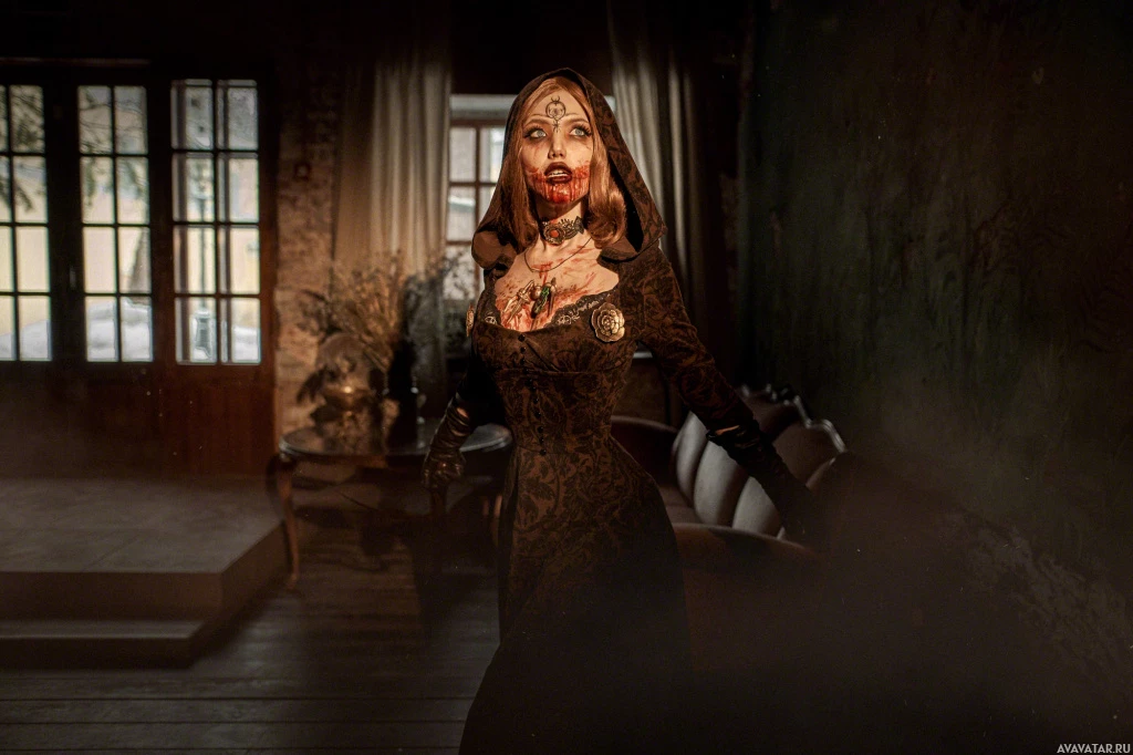 the video game "Resident Evil," specifically reminiscent of the Dimitrescu family. This character is known for their gothic, vampire-like appearance with pale skin and blood on their teeth, which adds to the horror theme often associated with