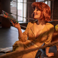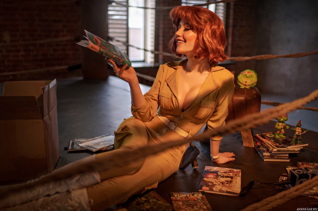 a yellow jumpsuit, knee-high boots, and a headband. The person is holding a book open in their hands and appears to be smiling at something off-frame. The setting looks like it could be