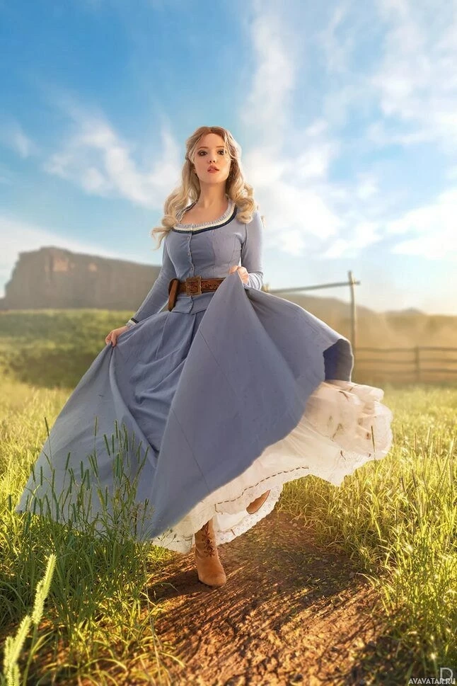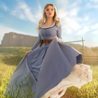 a young woman wearing a long, flowing blue dress with a skirt that has layers of fabric giving it volume. She is standing in
