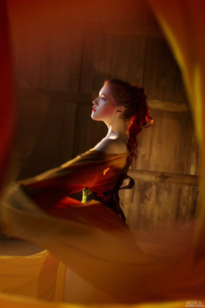 an indoor setting, possibly a room made of wood. The woman is looking upwards and to her right, and she seems to be posing for the photograph. The lighting in the photo gives it a warm,