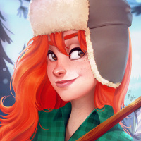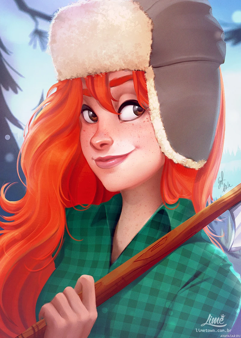 На картинке изображен анимированный персонаж из шоу «Гравити Фоллс». Она молодая девушка с рыжими волосами, в зимнем наряде, в том числе в пушистой шляпе и с палкой. Ее наряд предполагает холодную погоду, возможно, в месте, где присутствует снег или лед. У нее веселое выражение лица.