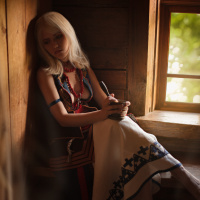 an indoor setting, possibly a wooden room with windows. The individual is wearing an elaborate costume that includes traditional elements like a patterned skirt and a top with intricate designs, which could be inspired by the cosplay culture associated with games such as "The Witcher" or similar