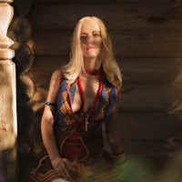 the video game "The Witcher 3: Wild Hunt." The individual is dressed in detailed costume with a medieval or fantasy-themed design, complete with armor and accessories that are consistent with the character's appearance in the game. They are posing for the photograph in front of a rustic wooden structure, possibly set within