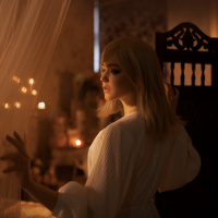 the video game "The Witcher." They are seen from behind and are standing near what looks like a window covered with drapes. The setting seems to be a room with vintage or historical decor, giving the impression of an indoor scene during twilight or evening, as indicated by