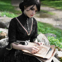 The image features a person dressed in costume, sitting on the ground outdoors with various items laid out before them. They appear to be engaged in an activity that may involve art or crafts, given the materials spread out around them. It's worth noting that this individual is cosplaying as Iris von Everec from "The Witcher 3: Wild Hunt"