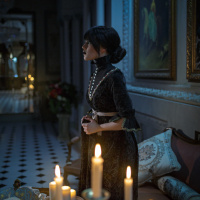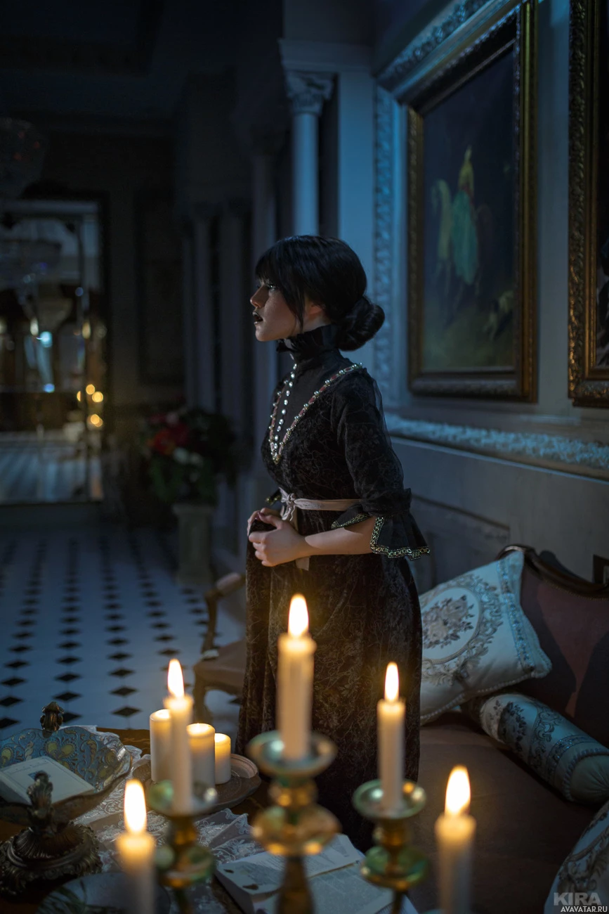 the video game "The Witcher 3: Wild Hunt," portrayed by actress Iris von Eseren. She is dressed in a costume that resembles the attire of her character and appears to be in a scene with candlelight illuminating the room around her, giving it an intimate or somber atmosphere. The setting looks like