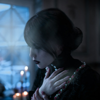 Anna Shaffer in the role. The setting appears to be an indoor space with a window showing a dark,