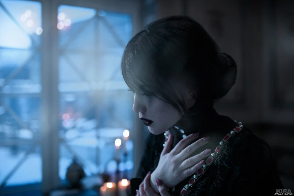 snowy landscape outside, and there are candles that give off a warm glow, which adds to the atmosphere of the scene.