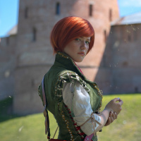 the character Shani from the game "The Witcher". The costume includes elements such as a green vest,