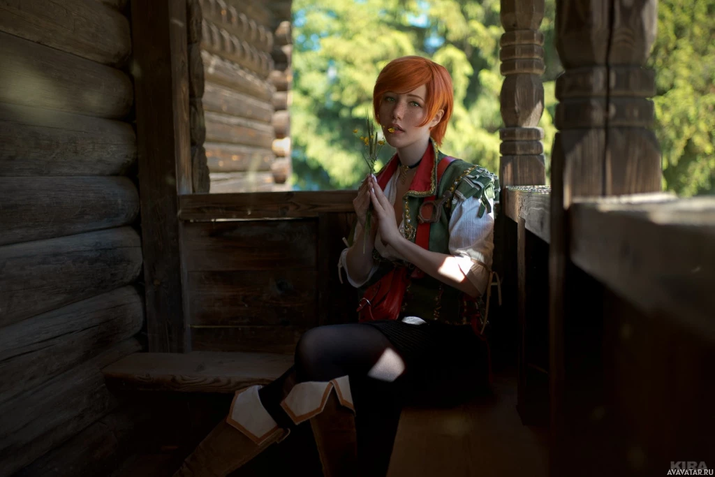 the video game "The Witcher 3," identifiable by the distinctive red hair and armor style, which are characteristic of Shani's look from the game. The person has their hand raised slightly as if they are holding something small, possibly a flower or other object. The setting appears to be outdoors with