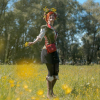 costume of a character from the "The Witcher" series. The overall atmosphere of the photo appears to be calm and serene, capturing a moment where the cosplayer seems immersed in their role amidst nature.