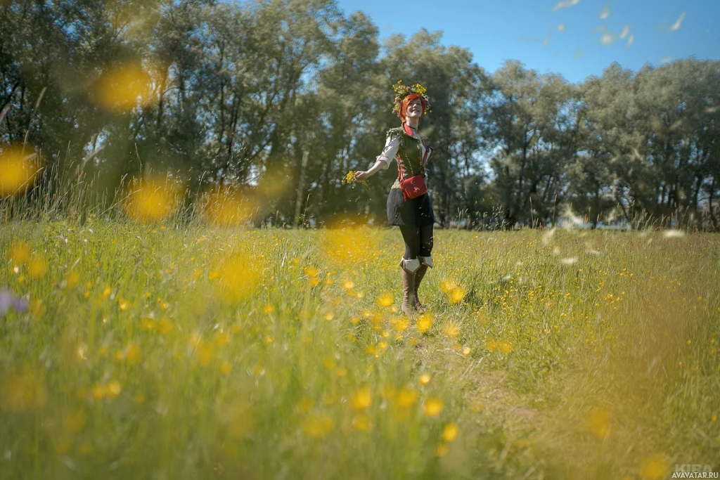 cosplay attire from "The Witcher" game. The individual is standing in a field that has yellow wildflowers and