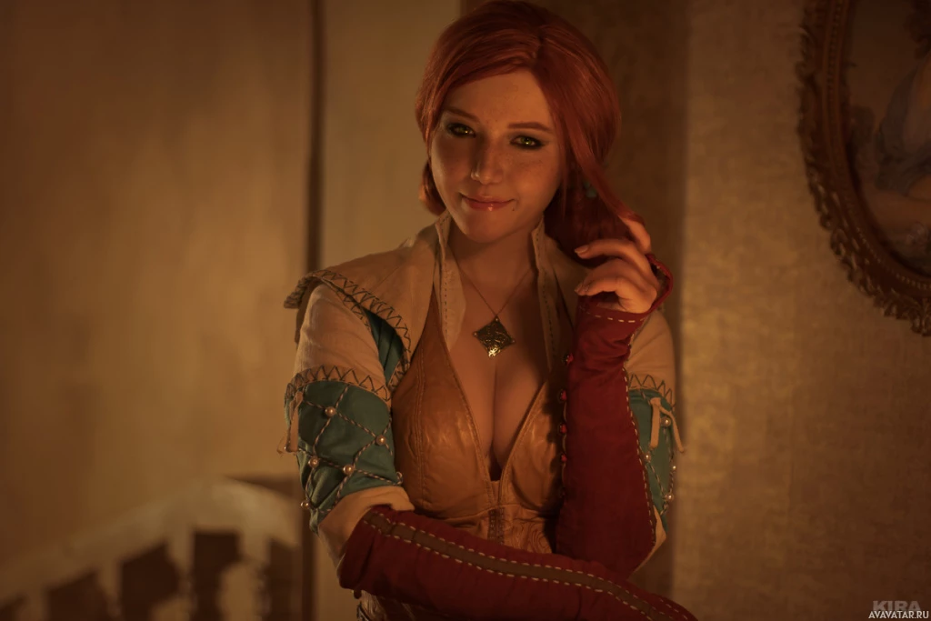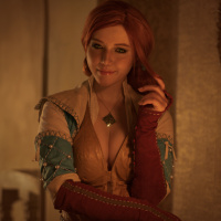 Triss Merigold, a sorceress and member of the School of the Cat. She appears to be dressed in her costume, which includes armor with