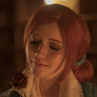 The image depicts a woman, presumably portraying the character Triss Merigold from "The Witcher 3: Wild Hunt"