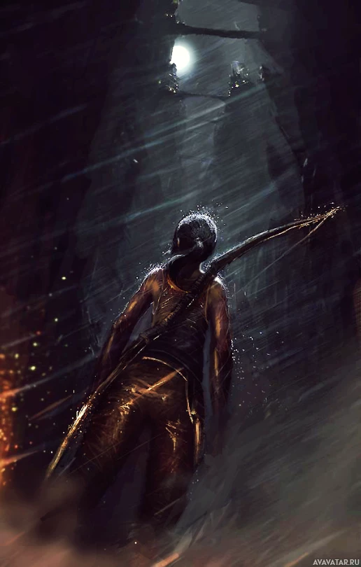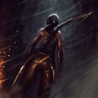 game protagonist known from the "Tomb Raider" series. She is standing in what looks like a cave or ruins with rain pouring down, which adds to the atmosphere of the scene. Her attire and equipment suggest that she is prepared for action or adventure, which aligns with her typical role as an explorer and
