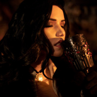 The image features a person dressed in cosplay, portraying the character Yennefer from "The Witcher" game series. The individual is holding what appears to be a goblet or cup and has closed eyes while singing or speaking with intensity.