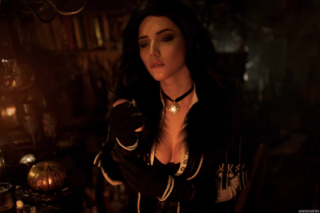 an interior setting that appears to be designed to look like a mystical or enchanted room. The person is wearing a costume with a fantasy-style outfit and makeup to portray Yennefer, including a choker,