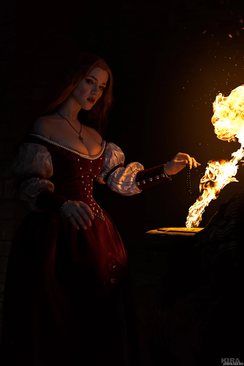 The image shows a woman dressed in a historical or fantasy-inspired costume, which includes a red and gold dress with ruffles. She has her hair styled in an updo, and she is holding what appears to be a candle, creating