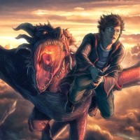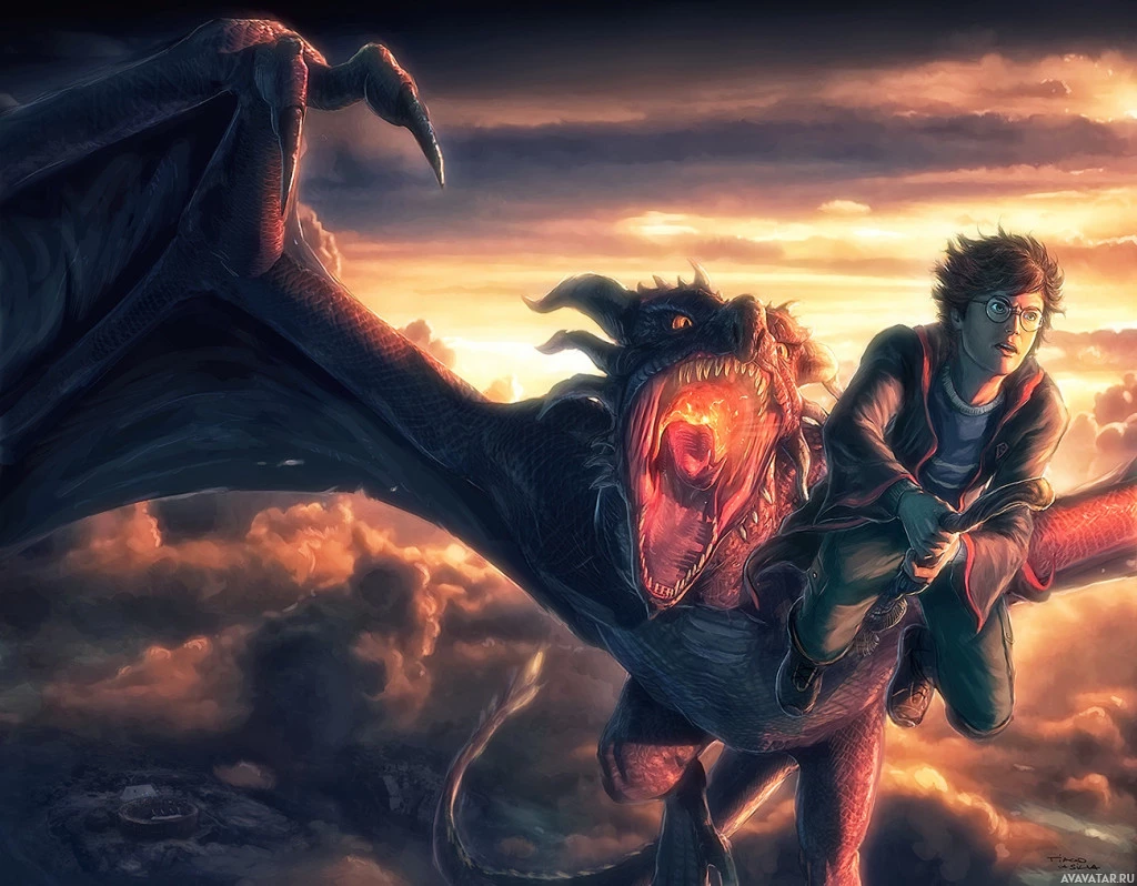 a fantasy scene featuring a character who appears to be inspired by Harry Potter, riding on the back of a dragon. This is not an official Harry Potter book cover or related media and seems to be