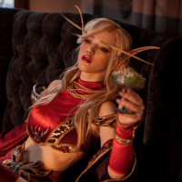 an elf costume from the Warcraft franchise. The individual is sitting on a dark couch, wearing fantasy-inspired clothing that includes red and gold accents with