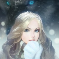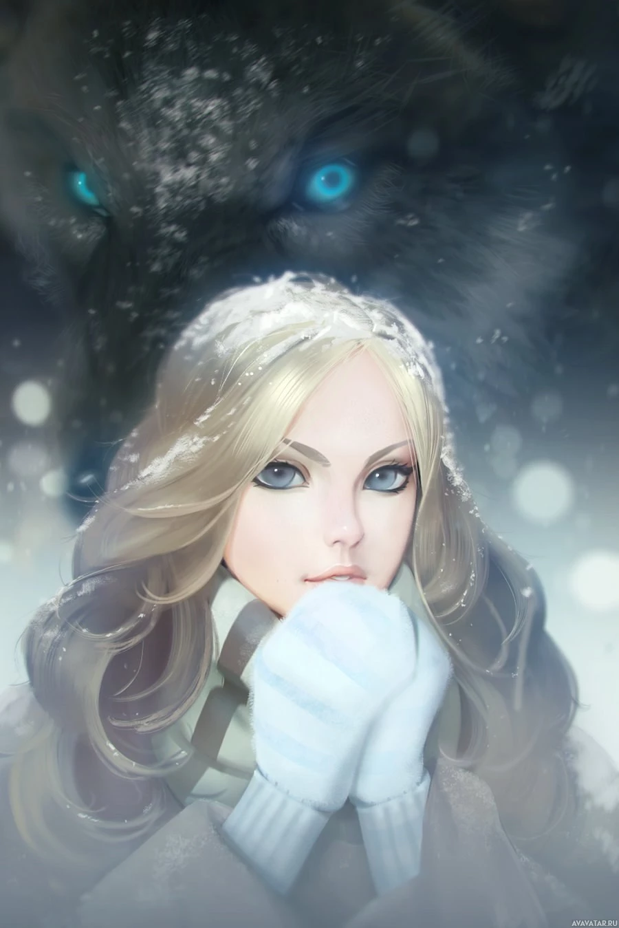 a wintry setting, possibly during the night or at twilight given the lighting. In the background, there's a wolf, which could imply a connection to nature or mythology, depending on the context of the story or artwork this character is from. The overall tone is serene and somewhat ethereal due to