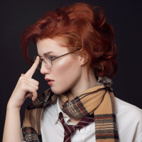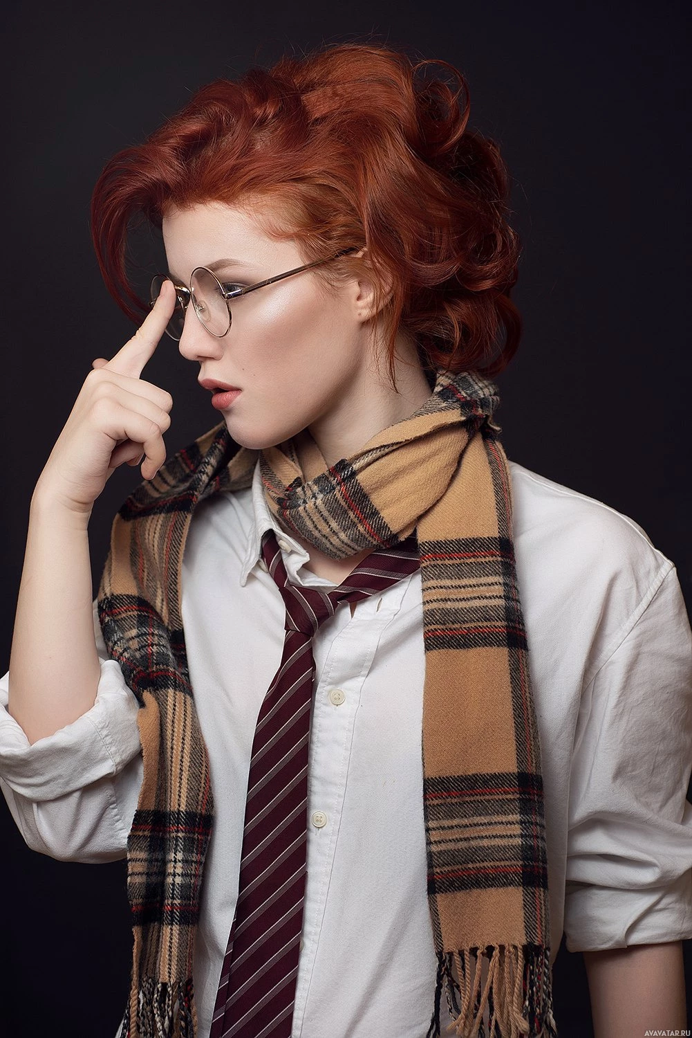 red hair and glasses, wearing a tie around their neck and a scarf. They appear to be posing for the photo with a thoughtful or serious expression on their face. The background is neutral-toned and does not provide any additional context about the setting.