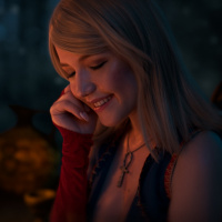 blonde hair and is wearing a costume that includes a dress with a floral pattern and red sleeves. She is smiling as she gazes into the distance, creating an overall impression of a joyful or content expression.