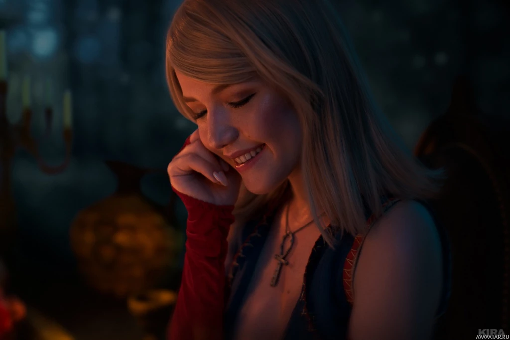 a female character from the video game "The Witcher 3: Wild Hunt." She is depicted in cosplay style, which means she is portraying her character from the game. The character has