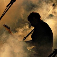 Картинка показывает музыканта, играющего на электрогитаре на сцене, с дымом или дымом, окружающим их. Основное внимание уделяется силуэту человека и его инструменту, что создает драматический эффект, который подчеркивает музыкальное исполнение.
