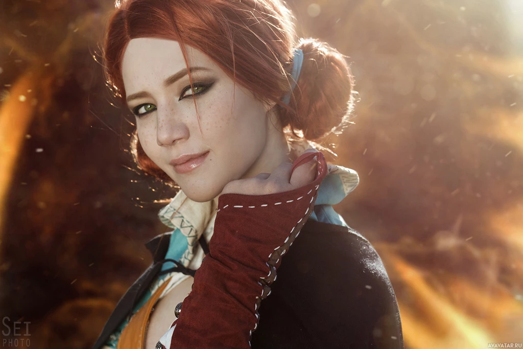 The image features a person dressed in cosplay, emulating the character Triss Merigold from "The Witcher 3: Wild Hunt"