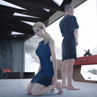 particular frame, Kara is kneeling on the floor, while Todd stands beside her, both appearing to be in a human-like pose with their bodies angled towards each other as if engaged in a conversation or interaction. The setting appears to be an indoor room with a modern and
