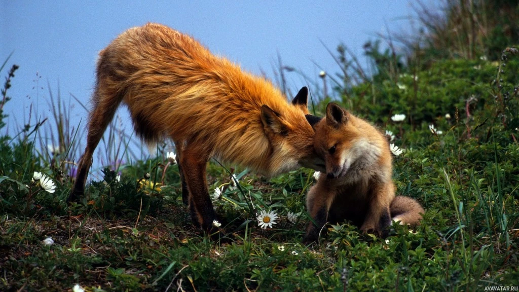 brown fur, while the other is smaller and seems to be a juvenile or cub. They are interacting closely, which might indicate
