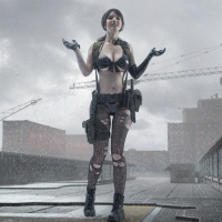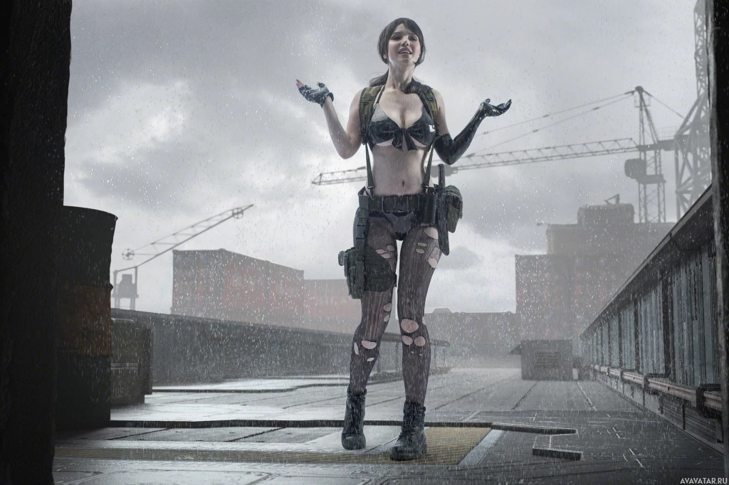 the video game series "Metal Gear Solid." She is portrayed in her signature attire, which consists of a military-style outfit with