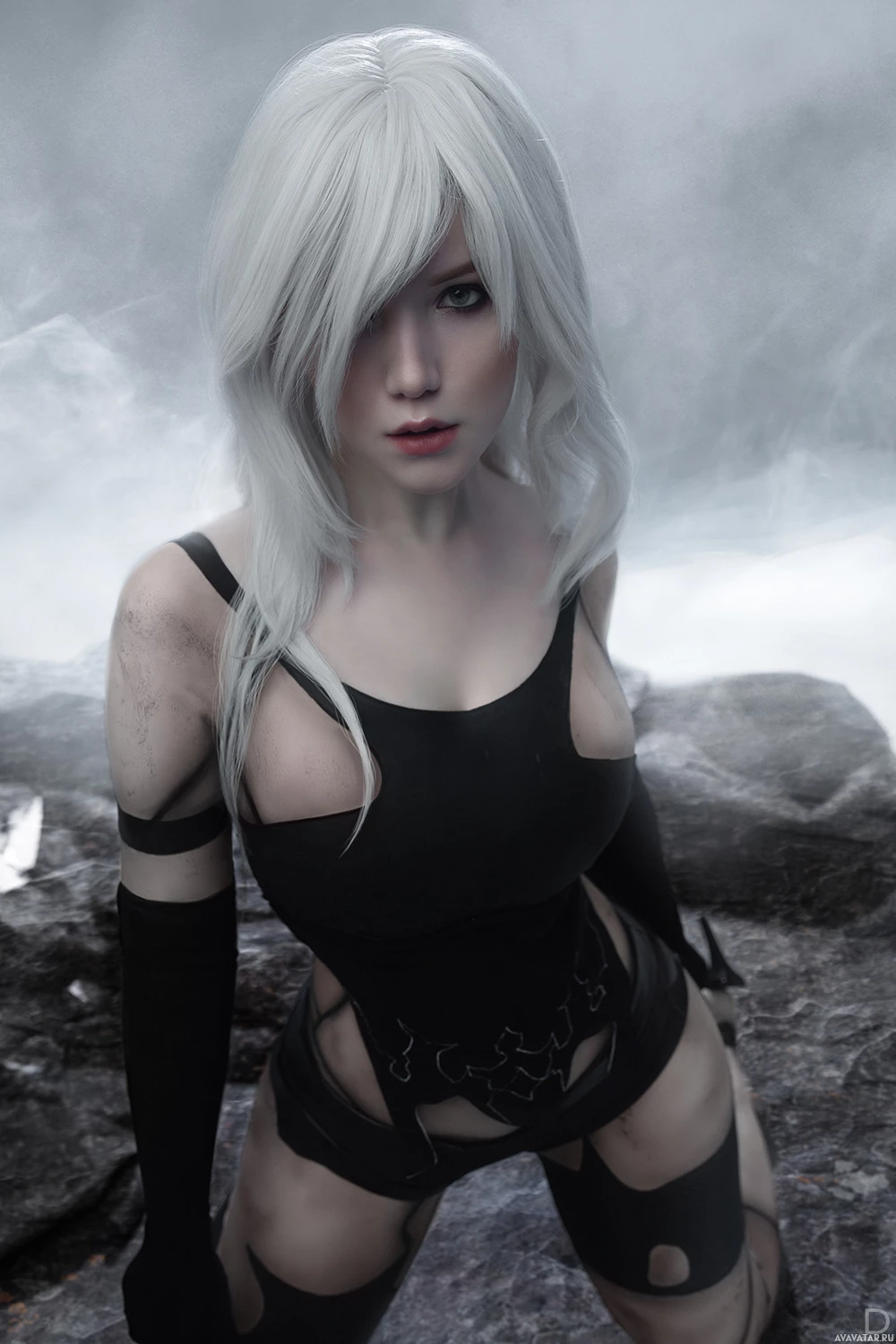 the video game "Nier: Automata." The cosplayer is wearing a black and white outfit that resembles the armor of