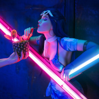 character design, and they have a distinctive visor over their eyes. The setting appears to be a neon-