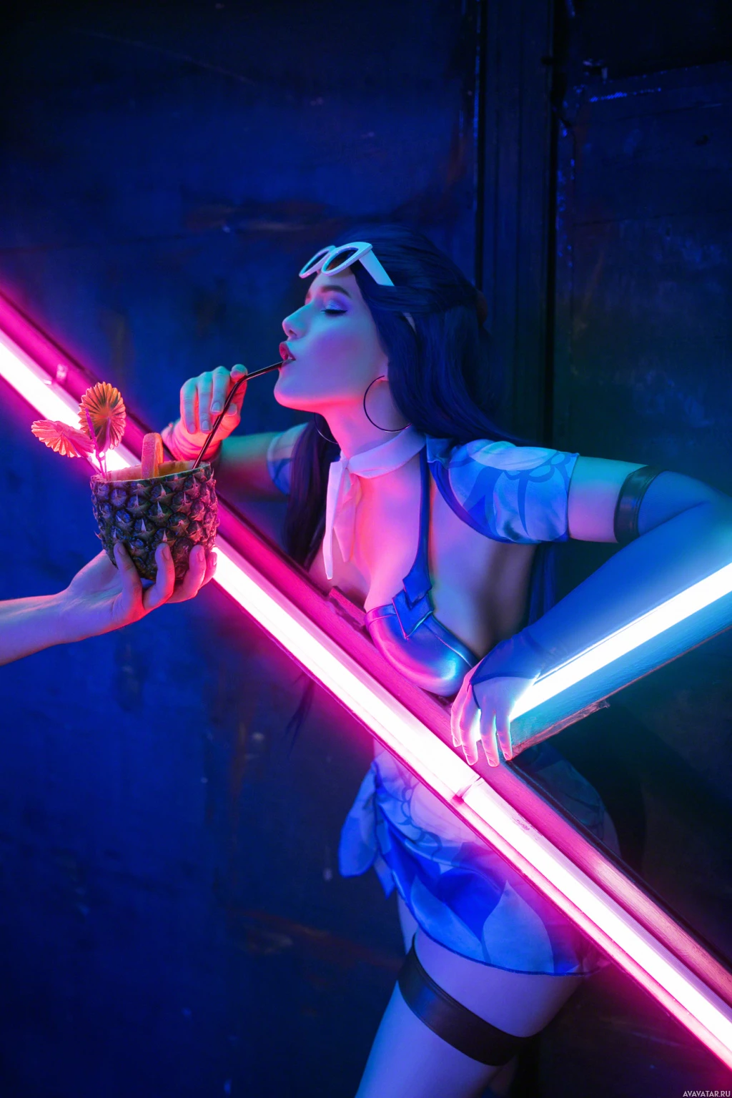 lit room with pink and blue lights, contributing to the futuristic aesthetic typical of Overwatch's environments. The person is holding what looks like a cocktail or drink in one hand while leaning against a neon barrier or wall.