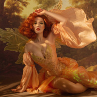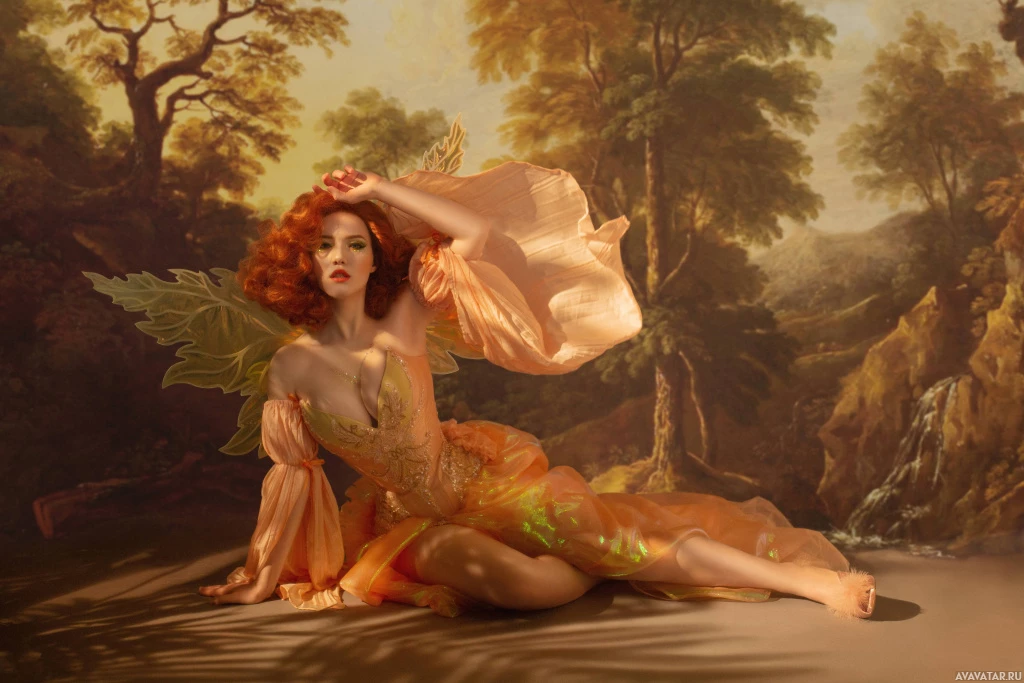 red hair wearing an elaborate dress that could be described as fantasy or fairy-like in style. She appears to have a pair of wings attached to her back and is posing in a way that suggests she may be portraying a character from mythology or a similar genre. The setting includes artistic elements such as a classical painting or tapestry background, which contributes to