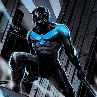 The image shows a character in a suit, known as Nightwing. He is depicted with a cape and emblem on his chest. It appears to be an illustration from a comic book or graphic novel.