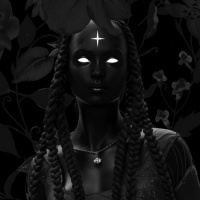 a dark outfit that has a textured pattern resembling flowers or leaves, and there is a visible symbol on their forehead that could be interpreted as a cross within a circle. The background consists of