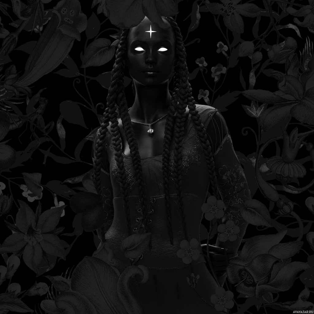 intricate patterns and floral motifs rendered in black and white, providing a stark contrast to the person's figure. The style of the image suggests it might be inspired by comic